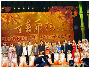 11月18日晚,浙江财经学院文化活动中心剧场掌声阵阵,欢歌如潮,下沙高教区14所高校的大学生,正以自己的青春激情演绎一台名为“青春飞扬”的大型综艺晚会,为期近一个月的下沙高教园区第二届大学生文化艺术节由此正式拉开帷幕。副省长盛昌黎宣布文化艺术节开幕,省政协副主席梁平波向文化艺术节主办方赠送题词。省委教育工委副书记、省教育厅副厅长蒋胜祥,团省委副书记徐旭以及下沙高教园区各高校的有关负责人出席了开幕式晚会。我院党委书记童学敏、副书记潘素芳及有关部门负责人应邀出席了晚会。